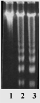 Quick Detection of Apoptotic DNA Ladder in Jurkat Cells. Apoptosis was induced in Jurkat cells with camptothecin (2 mM) for 0 hr (Lane 1), 6 hrs (Lane 2) and 12 hrs (Lane 3). Chromosomal DNA was prepared using the Quick Apoptotic DNA Ladder Detection Kit according to the kit instructions. 20 ml of each sample was electrophoresed on a 1.2% agarose/EtBr gel.
