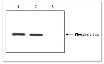 Analyses of JNK Specific Activity in Jurkat Extracts. Jurkat cells were untreated (Lane 3), or treated with anisomycin (10 ug/ml, Lane 1) or NaCl (0.5 M, Lane 2) for 30 min. Cell lysates were immunoprecipitated using a JNK-specific polyclonal antibody. JNK specific activity was then analyzed by Western blot analysis of the phosphorylation levels of c-Jun (1-79), using a phospho-c-Jun specific antibody included in the kit.